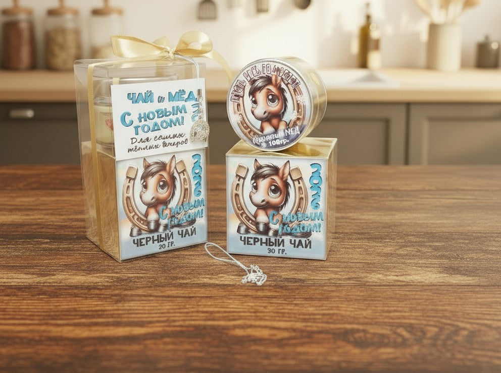Komplekt: tee ja kreemjas mesi koos uue aasta talismaniga.
